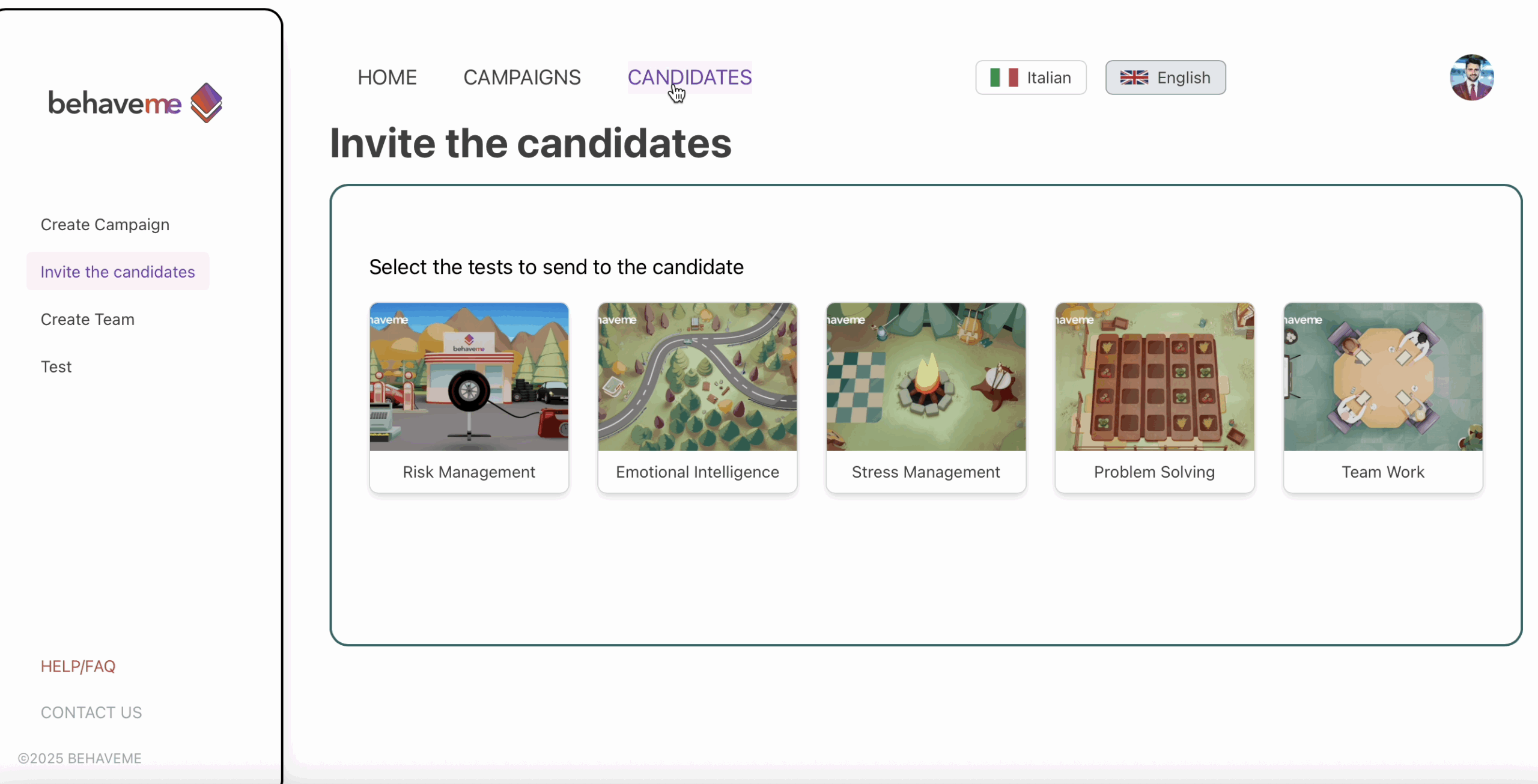 Behaveme è una piattaforma B2B che consente di predire le persone giuste da assumere in 5 minuti, attraverso simulazioni gamificate di situazioni lavorative ed AI che misurano in modo oggettivo le competenze. Non più CV e colloqui soggettivi: Behaveme apre l’epoca delle valutazioni oggettive e del job-fit predittivo, abbassando rischi di assunzioni sbagliate e costi di consulenza esterna.