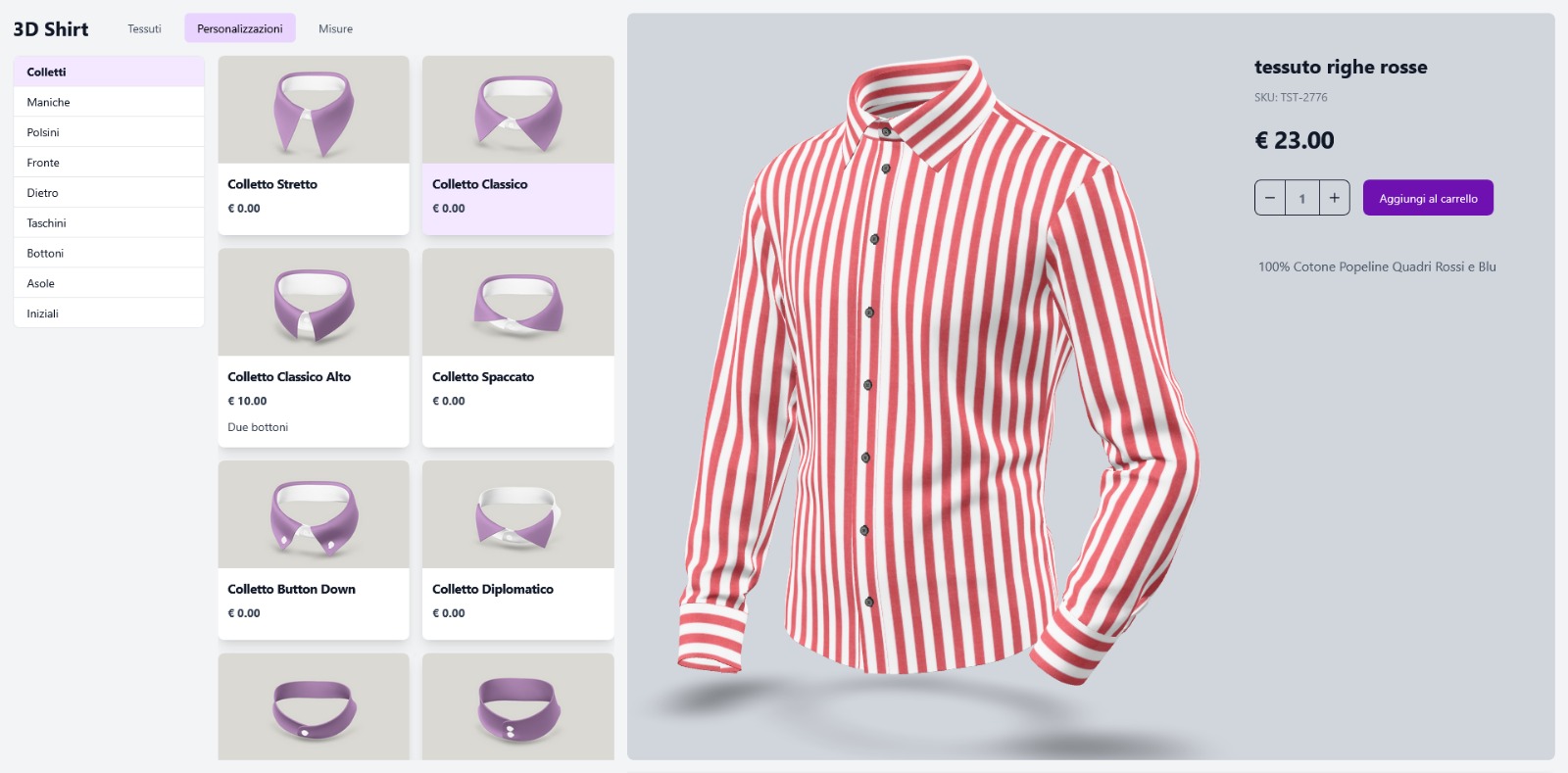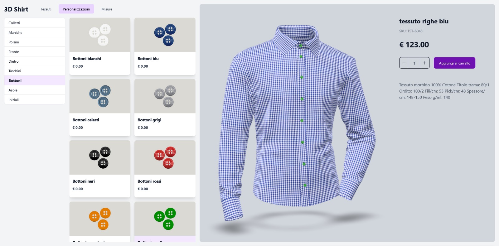L’esperienza di acquisto è quanto più possibile simile a quella che si vive in una sartoria reale: il cliente può scegliere un’ampia selezione di tessuti, modelli e personalizzazioni, sempre assistito da un assistente alla vendita proattivo e competente, che utilizza i più recenti modelli di intelligenza artificiale.