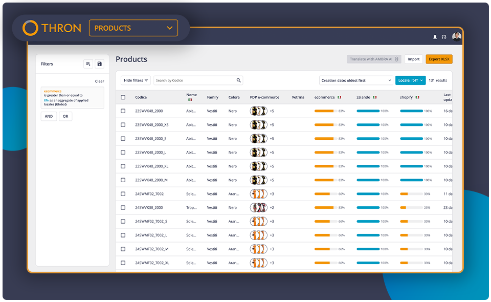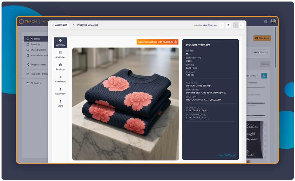 THRON è la piattaforma modulare AISaaS che unisce DAM, PIM e Channel Activation in un unico motore intelligente. Rende interconnessi, rapidi e reattivi i flussi di lavoro di Marketing, eCommerce e IT, centralizzando asset digitali e dati di prodotto in un’unica fonte di verità e distribuendoli in tempo reale su tutti i canali, online e offline. Aggiorna automaticamente contenuti e informazioni in tempo reale, elimina duplicazioni e file sparsi, riduce il numero di strumenti da gestire e libera i team da attività ripetitive.