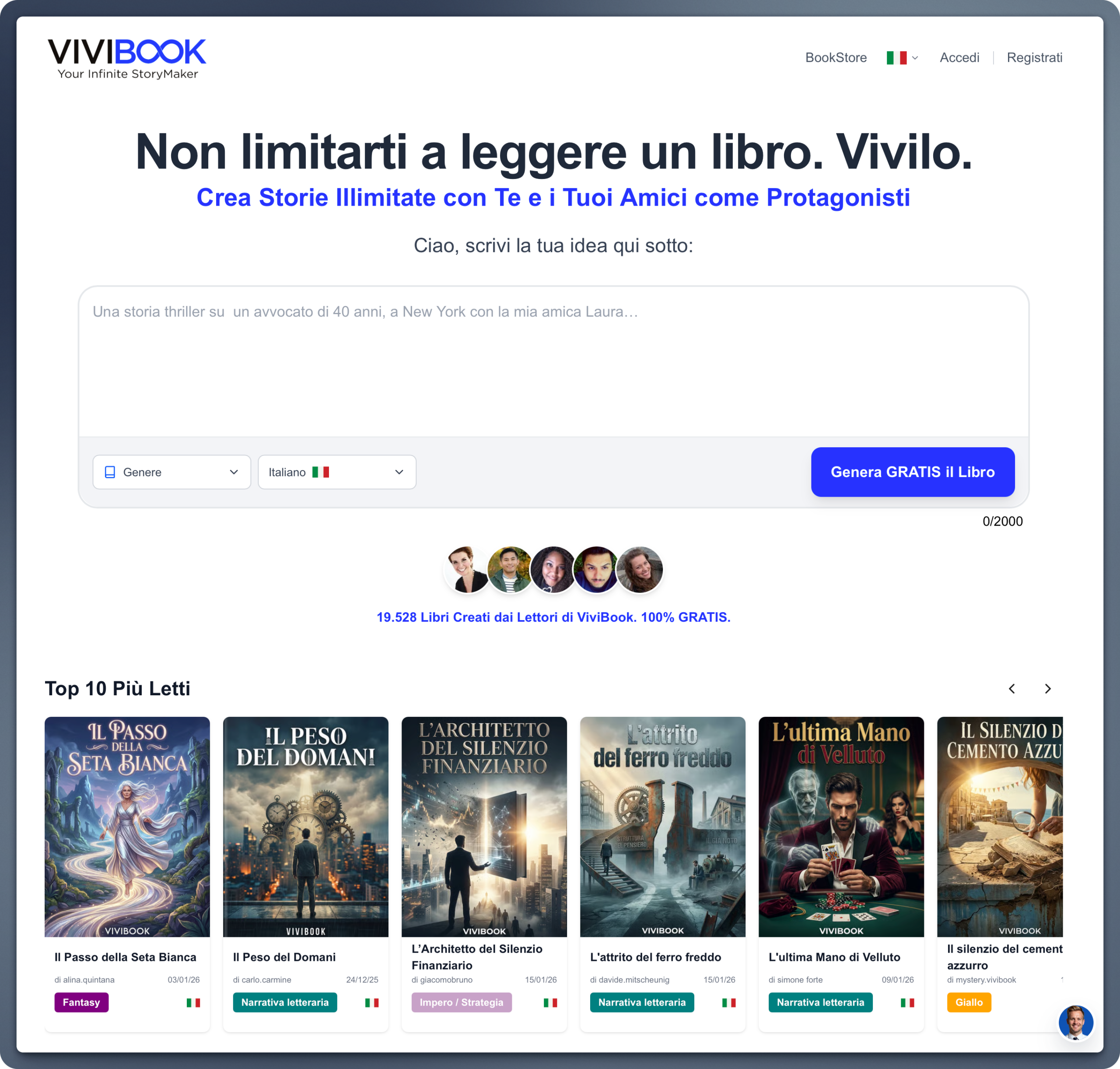 ViviBook è una piattaforma digitale basata su intelligenza artificiale che permette di creare e leggere libri personalizzati in pochi minuti, trasformando radicalmente il modo in cui le persone vivono le storie. Il sistema è progettato per generare contenuti su misura partendo dagli input dell’utente, rendendo ogni libro unico e rilevante. ViviBook non è una semplice libreria online, ma un Infinite BookStore in cui la lettura diventa un’esperienza attiva, immersiva e centrata sul lettore.